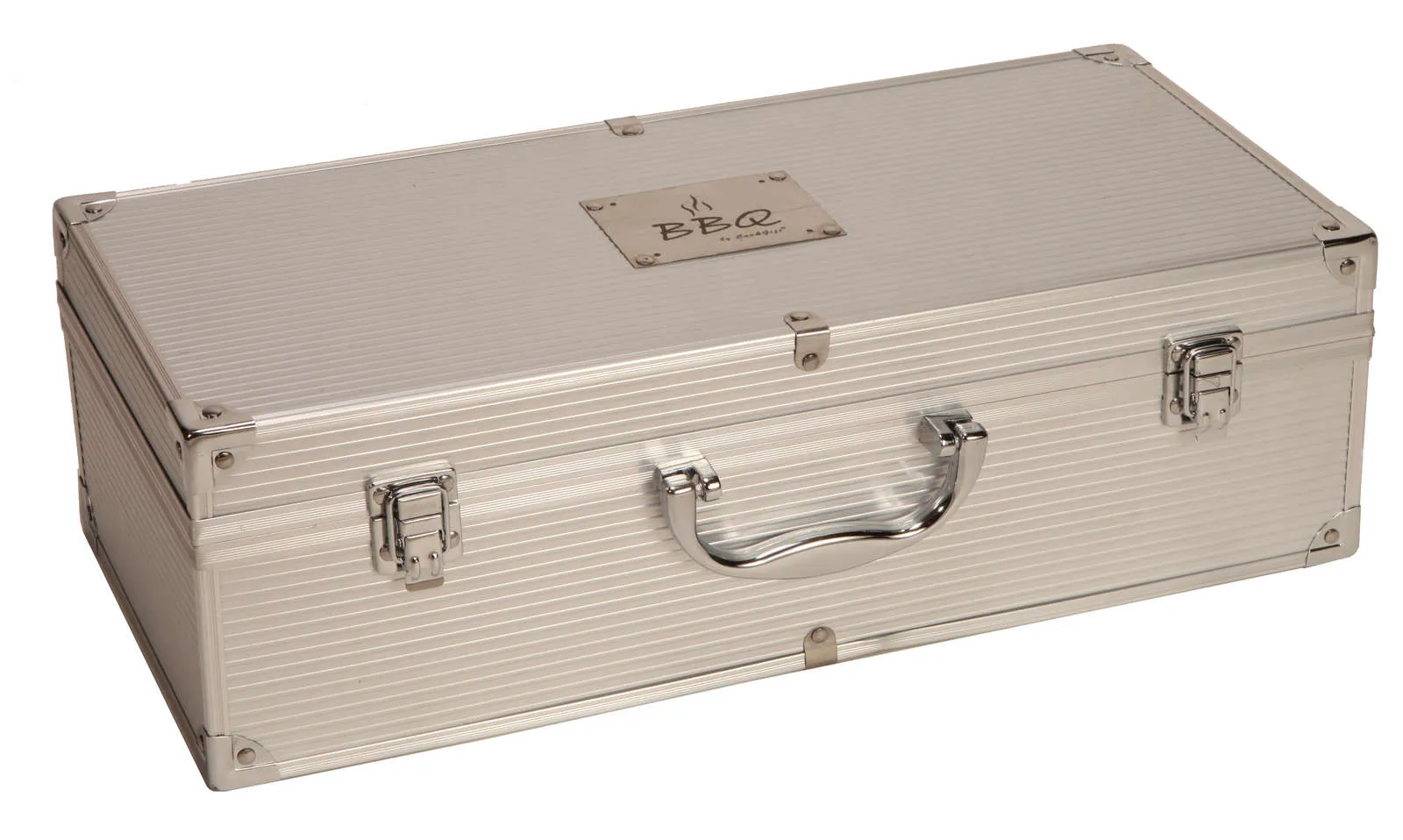 Le coffret BBQ est l’accessoire idéal pour les amateurs de grillades. Le coffret est conçu en forme de mallette fabriqué à partir de MDF recouvert d’aluminium. La forme du coffret ainsi que la poignée facilite le transport.