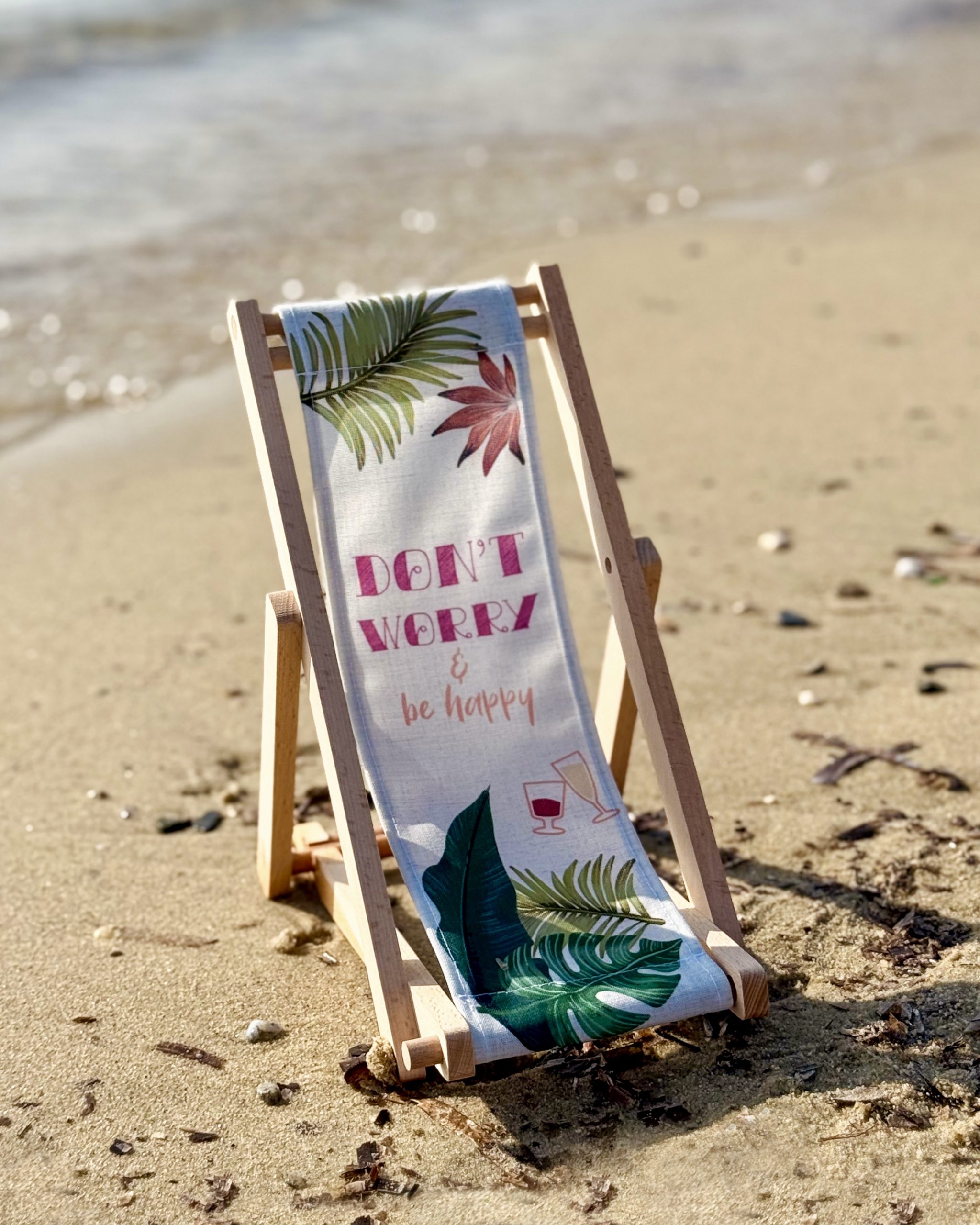 Apportez une touche originale et positive à la présentation de vos bouteilles avec ce support transat pliable en bois naturel et toile imprimée de l’inscription « Don’t Worry Be Happy ». Adapté pour une bouteille standard de 75 cl, il allie robustesse, légèreté et facilité de rangement.