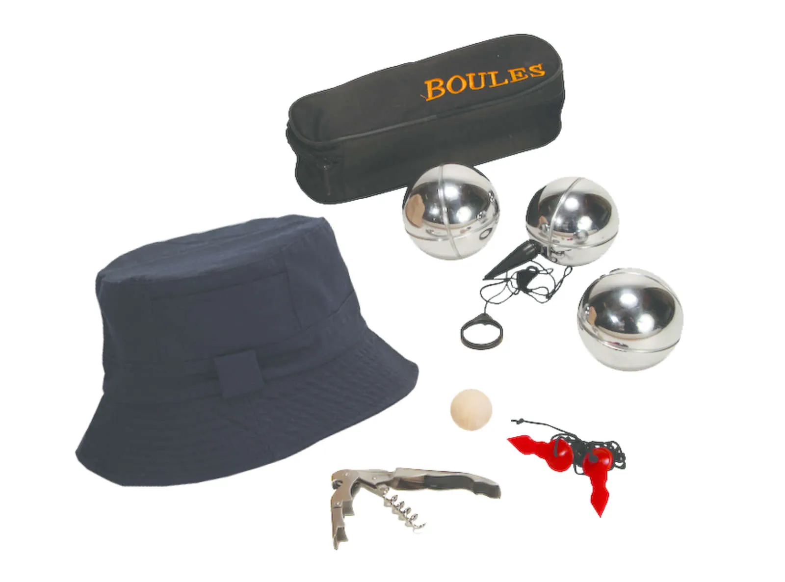 À l’intérieur, vous avez un compartiment pour mettre une bouteille de vin (non fournie) ou autre et deux autres emplacements dans lesquels vous trouverez la fameuse triplette de boules en acier ainsi que le cochonnet, le fil mesureur, le ramasse-boules aimanté, un sommelier pour déboucher la bouteille et pour finir ce parfait équipement, le bob indispensable pour vous protéger des rayons ardents du soleil en été…